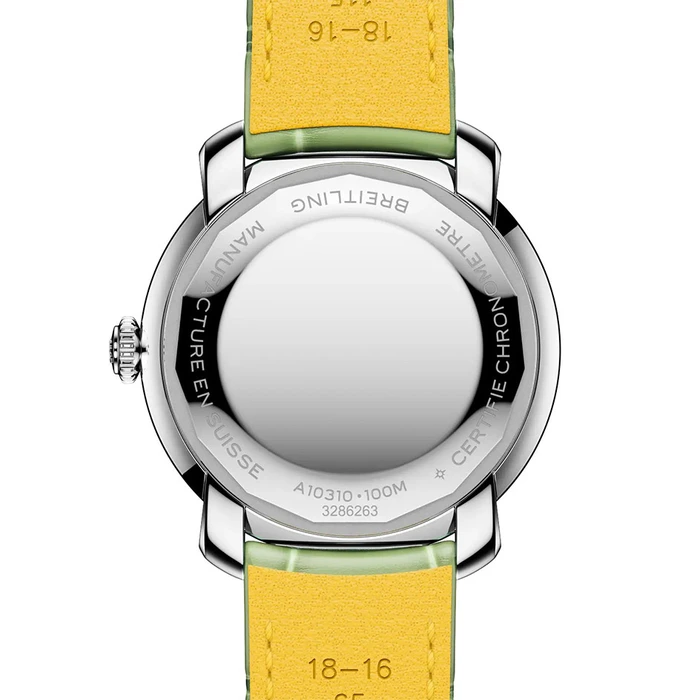 The Breitling Lady Premier Automatic 36 A10310671L1P1 watch has an Automatic movement with 10 Bar (100 meters) of water resistance, Stainless Steel case material, Purple dial color and Leather Strap.