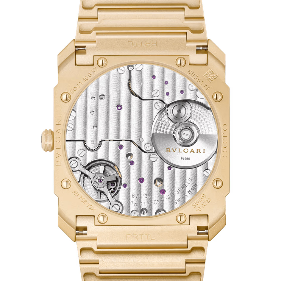 Octo Finissimo Automatic watch with mechanical manufacture ultra-thin movement (2.23 mm thin), automatic winding, platinum microrotor, hours, minutes and small seconds functions, BVL138 calibre decorated by hand with Côtes de Genève, chamfering and perlage finishing, 60-hour power reserve and 21'600 VpH (3Hz) frequency. 40 mm sandblasted 18 kt yellow gold case (6.40 mm thin), sandblasted 18 kt yellow gold screw-down crown with ceramic insert, 18 kt yellow gold dial, black hands and indexes, transparent case back, sandblasted 18 kt yellow gold bracelet with integrated folding buckle. Water-resistant up to 100 metres.