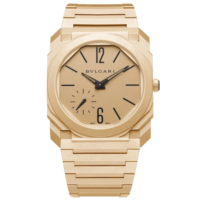 A true icon of the 21st century, the Octo Finissimo Automatic watch embodies the rare fusion of bold Italian design and Swiss engineering. Crafted in sandblasted 18 kt yellow gold, this ultra-sophisticated timepiece exudes contemporary elegance while showcasing forward-thinking mechanics. A testament to Bvlgari’s integral bond between jewellery savoir-faire and watchmaking artistry, it reflects the Maison’s distinctive approach to working with precious materials, as well as its ability to set new design trends in the world of Swiss-made timepieces.