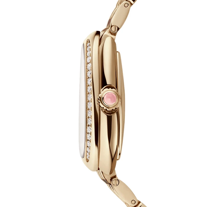 A blend of sensuality, mystery and contemporary glamour, the Serpenti Seduttori watch in 18 kt yellow gold makes time even more precious. Powered by a self-winding mechanical movement, its white opaline dial, framed by the distinctive drop-shaped watch head, is lit by a diamond-set bezel for a refined and dazzling effect. Inspired by the serpent’s scales, the supple and enveloping bracelet is crafted as an intricate hexagonal mesh, sealing the perfect encounter between the world of jewellery and watchmaking. Serpenti Seduttori watch with mechanical manufacture movement with automatic winding, calibre Lady Solotempo BVS100, hours, minutes and seconds functions, 50 hours power reserve. 34 mm 18 kt yellow gold case, bezel set with brilliant-cut diamonds, 18 kt yellow gold crown set with a cabochon-cut pink rubellite, white opaline dial, yellow gold-plated hands and indexes, 18 kt yellow gold bracelet with folding buckle. Water-resistant up to 30 metres.