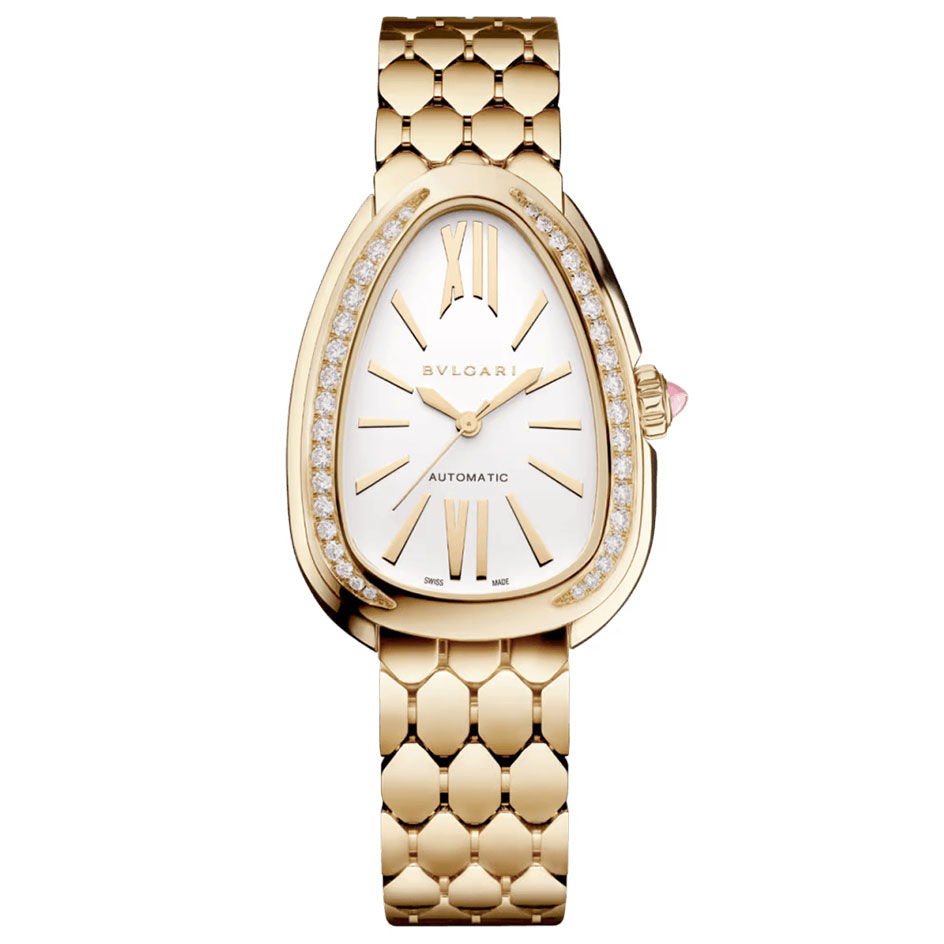 Serpenti Seduttori 103898 watch has a Automatic movement with 3 Bar (30 meters) of water resistance, Yellow Gold with diamonds case material, White dial colour and Yellow Gold bracelet.