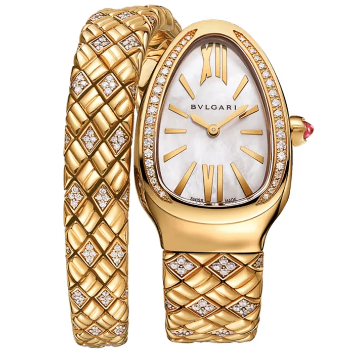 Serpenti Spiga watch 103747 has a Quartz movement with 3 Bar (30 meters) of water resistance, yellow gold with Diamonds case material, white mother of pearl dial and yellow gold with diamonds bracelet.