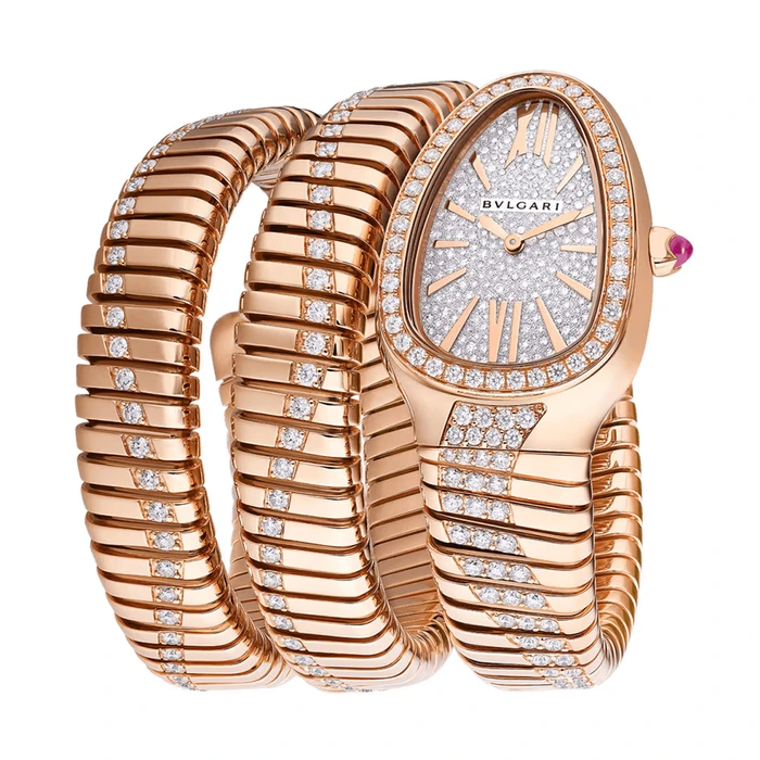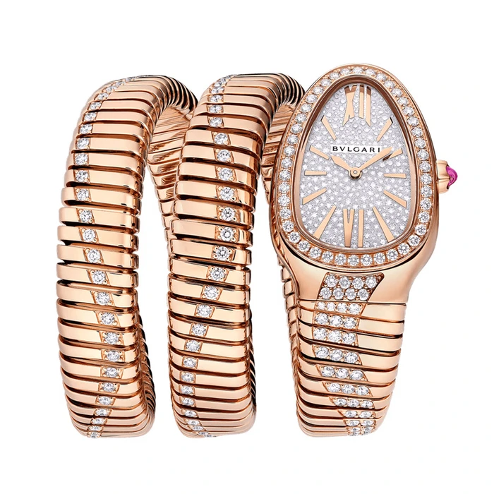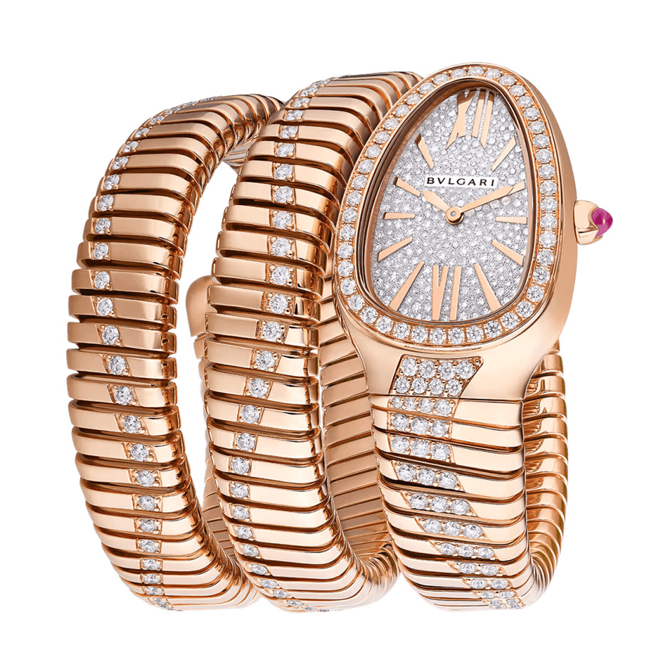 Merging two of the most iconic aesthetic signatures of Bvlgari’s creativity, the Serpenti Tubogas Infiniti double-spiral watch in 18 kt rose gold coils the sinuosity of the snake with the contemporary soul of Tubogas. The head of the mythical animal is rendered by a diamond-set case and a full pavé dial, while the mesmerising suppleness of the bracelet evokes the fluid lines of the serpent’s flexuous body. As a symbol of Serpenti’s endless metamorphosis, a serpentine silhouette in brilliant-cut diamonds extends from the watch’s head to the tail.