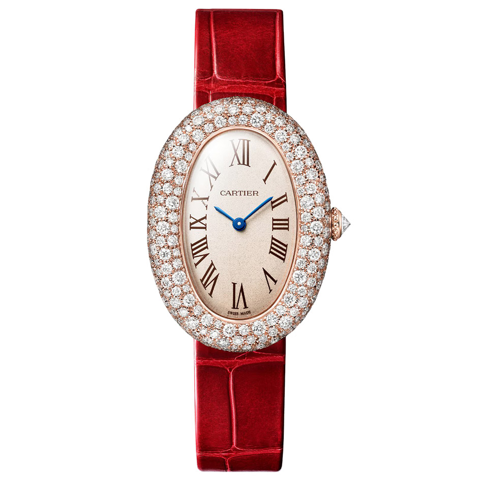 Baignoire watch WJBA0047 medium model, quartz movement. 18K rose gold (750/1000) case set with 286 brilliant-cut diamonds totaling 3.56 carats. 18K rose gold (750/1000) beaded crown set with a brilliant-cut diamond totaling 0.14 carats. Silvered grained dial, blued-steel sword-shaped hands, sapphire crystal. Red leather strap, 18K rose gold (750/1000) ardillon buckle. Length: 36 mm, width: 26 mm, thickness: 8.5 mm. Water-resistant up to 3 bar (approx. 30 meters/100 feet).