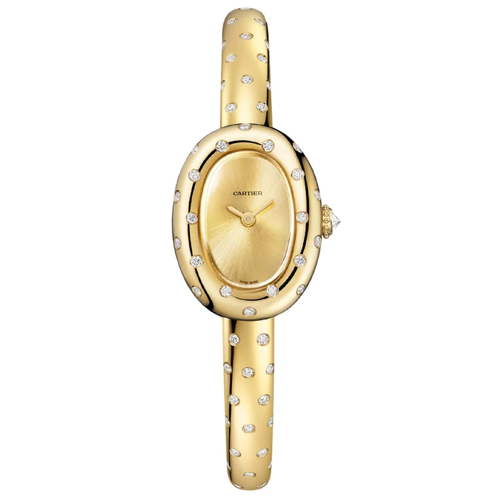 Baignoire WJBA0064 mini model has a quartz movement. 18K yellow gold (750/1000) case set with 29 brilliant-cut diamonds totaling 0.29 carats. 18K yellow gold (750/1000) beaded crown set with a brilliant-cut diamond totaling 0.07 carats. 18K yellow gold (750/1000) rigid bracelet, set with 46 brilliant-cut diamonds totaling 0.45 carats. Golden dial, golden-finish steel sword-shaped hands, sapphire crystal. Length: 24.6 mm, width: 18.7 mm, thickness: 7.2 mm. Water-resistant up to 3 bar (approx. 30 meters/100 feet).