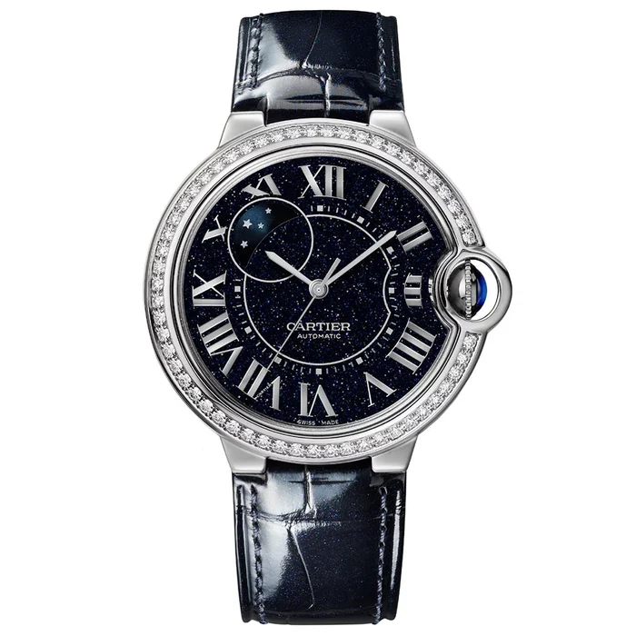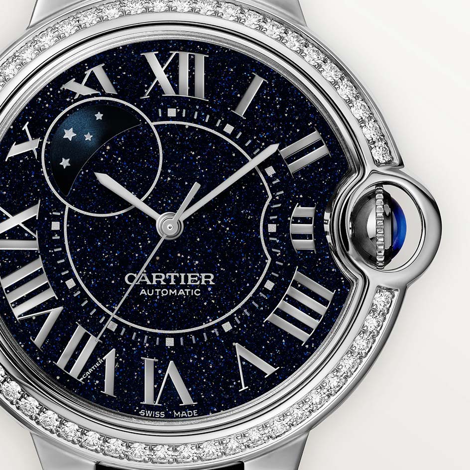 Ballon Bleu de Cartier watch, 36 mm. Mechanical movement with automatic winding, day/night. 18K white gold (750/1000) case set with 54 brilliant-cut diamonds totaling 0.79 carats. Fluted 18K white gold (750/1000) crown set with a sapphire cabochon. Aventurine glass dial with day and night indicator disc. Rhodiumized steel sword-shaped hands. Sapphire crystal. Varnished sparkling blue leather strap, 18K white gold (750/1000) ardillon buckle. Case thickness: 12.11 mm. Water-resistant up to 3 bar (approx. 30 meters/100 feet).