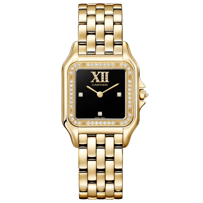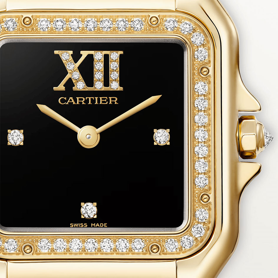 Panthère de Cartier watch, medium model, quartz movement. 18K yellow gold (750/1000) case set with 44 brilliant-cut diamonds totaling 0.28 carats. Dimensions: 36.5 mm x 26.7 mm, thickness: 6.8 mm. 18K yellow gold (750/1000) octagonal crown set with a brilliant-cut diamond totaling 0.02 carats. Black lacquer dial set with 15 brilliant-cut diamonds totaling 0.03 carats, golden-finish sword-shaped hands. 18K yellow gold (750/1000) bracelet. water-resistant up to 3 bar (approx. 30 meters/100 feet).