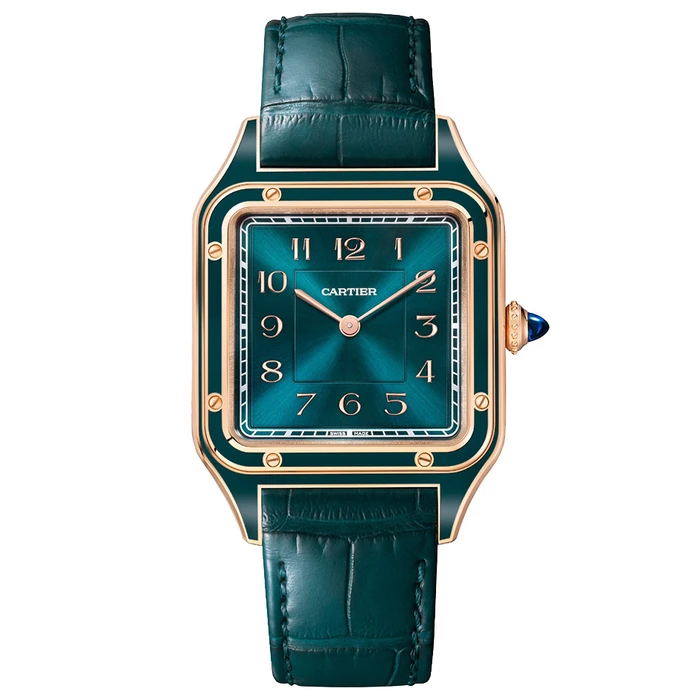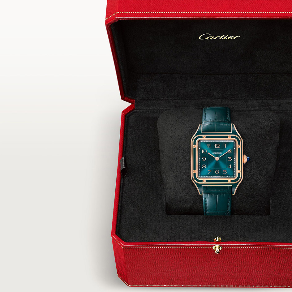 Santos-Dumont watch WGSA0098, large model, mechanical movement with manual winding 430 MC. 18K rose gold 750/1000 case, beaded crown set with a blue cabochon-shaped sapphire, sunray-brushed and lacquered peacock blue dial with Arabic numerals, gold-finish polished steel sword-shaped hands, sapphire crystal. Case back engraved with the handwritten signature of Alberto Santos-Dumont. Strap in blue leather, 18K rose gold (750/1000 ardillon buckle. Case dimensions: 43.5 x 31.4 mm, thickness: 7.3 mm. Water-resistant up to 3 bar (approx. 30 meters/100 feet).
