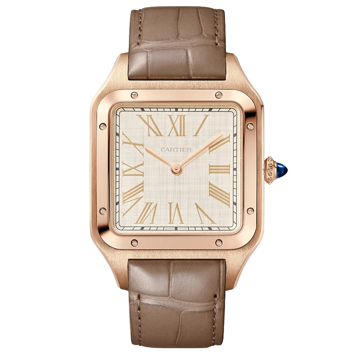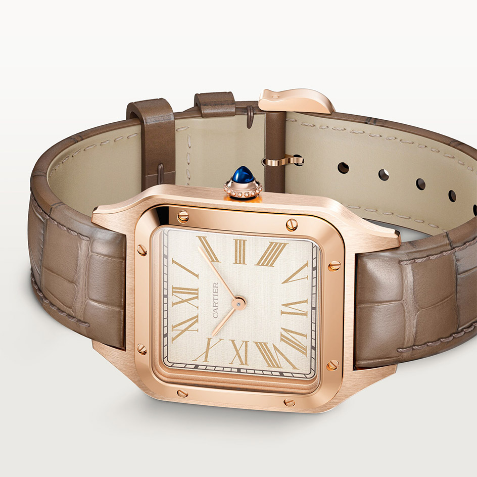 Santos-Dumont watch WGSA0112, extra-large model, Manufacture mechanical movement with manual winding, caliber 430 MC. 18K rose gold (750/1000) case, beaded crown set with a sapphire cabochon, linen inspired beige dial, rose gold-colored Roman numerals, blued-steel sword-shaped hands, sapphire crystal. Caseback engraved with the handwritten signature of Alberto Santos-Dumont. Brown leather strap and 18K rose gold (750/1000) ardillon buckle. Case dimensions: 46.6 mm x 33.9 mm, thickness: 7.5 mm. Water-resistant up to 3 bar (approx. 30 meters/100 feet). 1904, Louis Cartier granted the wish of the famous Brazilian aviator Alberto Santos Dumont: to be able to tell time while flying. The birth of one of the first ever wristwatches sealed the bonds of friendship between these two pioneers. The rounded angles of the dial, the seamless curve of the horns, and the exposed screws made for an iconic watch that would inspire countless reinterpretations.