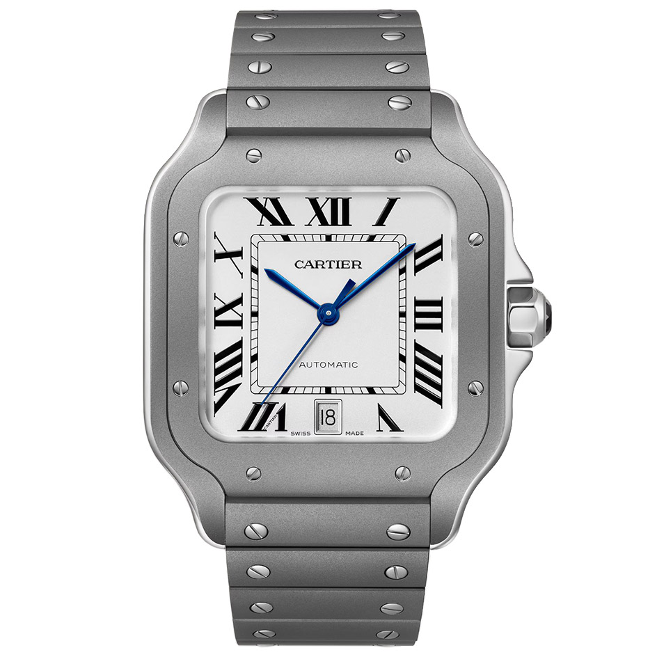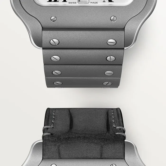 Santos watch, large model, mechanical movement with automatic winding, caliber 1847 MC. Titanium case, 7-sided crown set with a black faceted synthetic spinel, silvered opaline dial, blued-steel sword-shaped hands, sapphire crystal. Titanium bracelet. Second strap in nubuck leather, with interchangeable folding steel buckle. Both are fitted with the "QuickSwitch" interchangeability system. Case width: 39.8 mm, thickness: 9.38 mm. Water-resistant up to 10 bar (approx. 100 meters/330 feet).