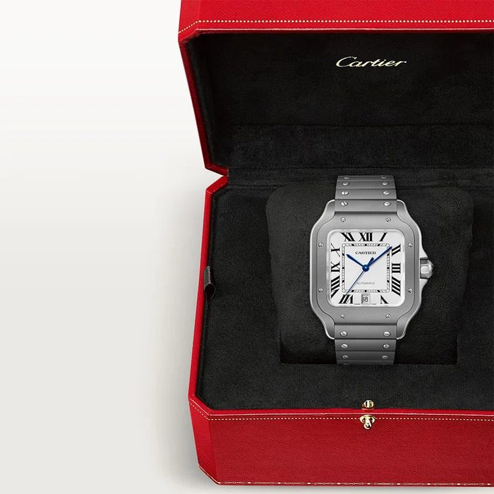 Santos de Cartier watch WSSA0089 has an Automatic movement with 10 Bar (100 meters) of water resistance, Titanium case material, White dial and Titanium bracelet.