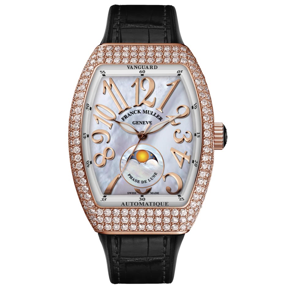 The Franck Muller Vanguard Mother of Pearl V 32 SC AT FO L REL MOP D (NR) watch has an Automatic movement with 3 Bar (30 meters) of water resistance, Pink Gold with Diamonds case material, Mother-of-Pearl dial color and Leather strap with 40 Hours of power reserve.