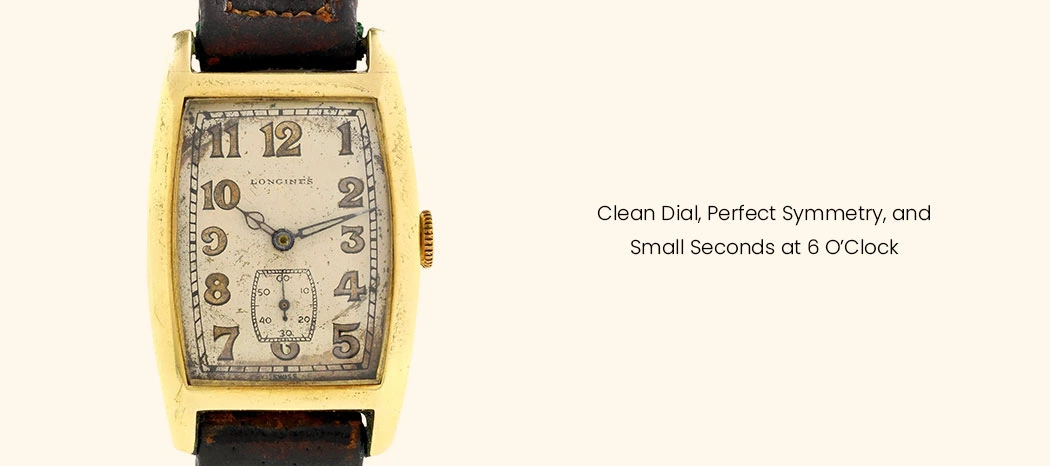 Central to the watch’s allure is its light colored dial, a warm, subtly gradient surface that captures light with exceptional depth and sophistication. This soft hue, neither stark nor overly bold, serves as the perfect canvas for crisp Art Deco numerals, applied or printed in a balanced, geometric style that defines the period’s modernity. A classic subsidiary seconds register at 6 o’clock maintains perfect symmetry without clutter, its small blued steel hand contrasting elegantly against the main display. Slender, tapered, blued steel Gothic hands sweep across the face with precision, their metallic sheen adding subtle visual interest that ties the composition together. Restored to near-original vibrancy while preserving authentic character, the dial avoids excessive refinishing or heavy patina. This careful balance of color, proportion, and finish creates a composition that is legible at a glance yet richly rewarding under closer scrutiny, a quiet masterclass in dial design that rewards discerning collectors.