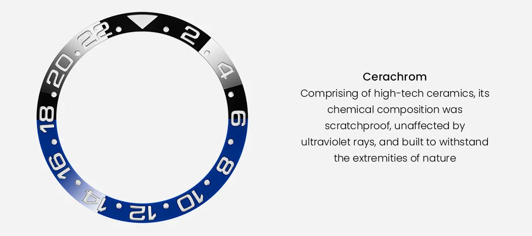 As all Rolex cases, bracelets, and clasps evolved through generations to express brilliance in technicality and resilience, so did its bezels. In 2005, Rolex patented three new Cerachrom components – bezel insert, bezel ring, and compression ring. Comprising of high-tech ceramics, its chemical composition was scratchproof, unaffected by ultraviolet rays, and built to withstand the extremities of nature. It was fitted on the GMT-Master II, Yacht-Master, and other professional Rolex models.