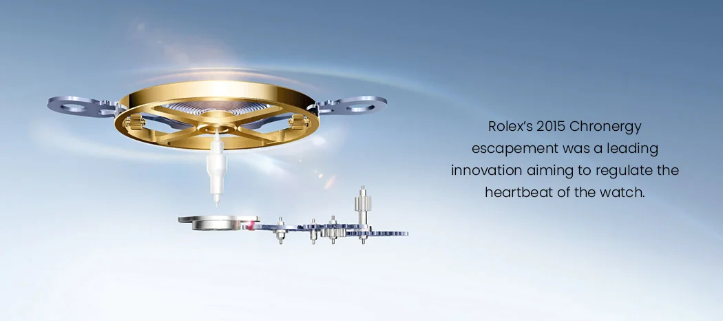 Over the years, the fundamental mechanics of the Swiss lever escapement have been optimized in geometric architecture and choice of materials to achieve more efficient energy escapement. Rolex’s 2015 Chronergy escapement was a leading innovation aiming to regulate the heartbeat of the watch. In a timed dance between two pallets and an anchor, it carefully halted and released the rotation of the dented balanced wheel. This happened eight times per second, delivering 28,800 rounds per hour, 700,000 times a day, and 250 million times a year, resulting in 15% greater efficiency than a standard Swiss lever escapement.