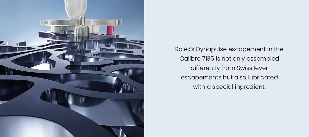 Rolex’s Dynapulse escapement in the Calibre 7135 is not only assembled differently from Swiss lever escapements but also lubricated with a special ingredient. Appropriate lubrication of the escapement is essential for energy regulation optimization. Considering the functionality of an escapement and the temperature variations that occur, Rolex chose oil rather than grease as a lubricating agent. Furthermore, every escape wheel tooth and escape wheel pivot point requires careful lubrication with a precise amount of oil, down to the scale of nanolitres. Applied using a curved precision needle, this delicate and complex task is carried out professionally on an external support, before being inserted into the movement. For Rolex, this is a completely novel and innovative approach, striving to enhance the reliability and performance of the brand’s watches in the long run, with longer intervals between services.