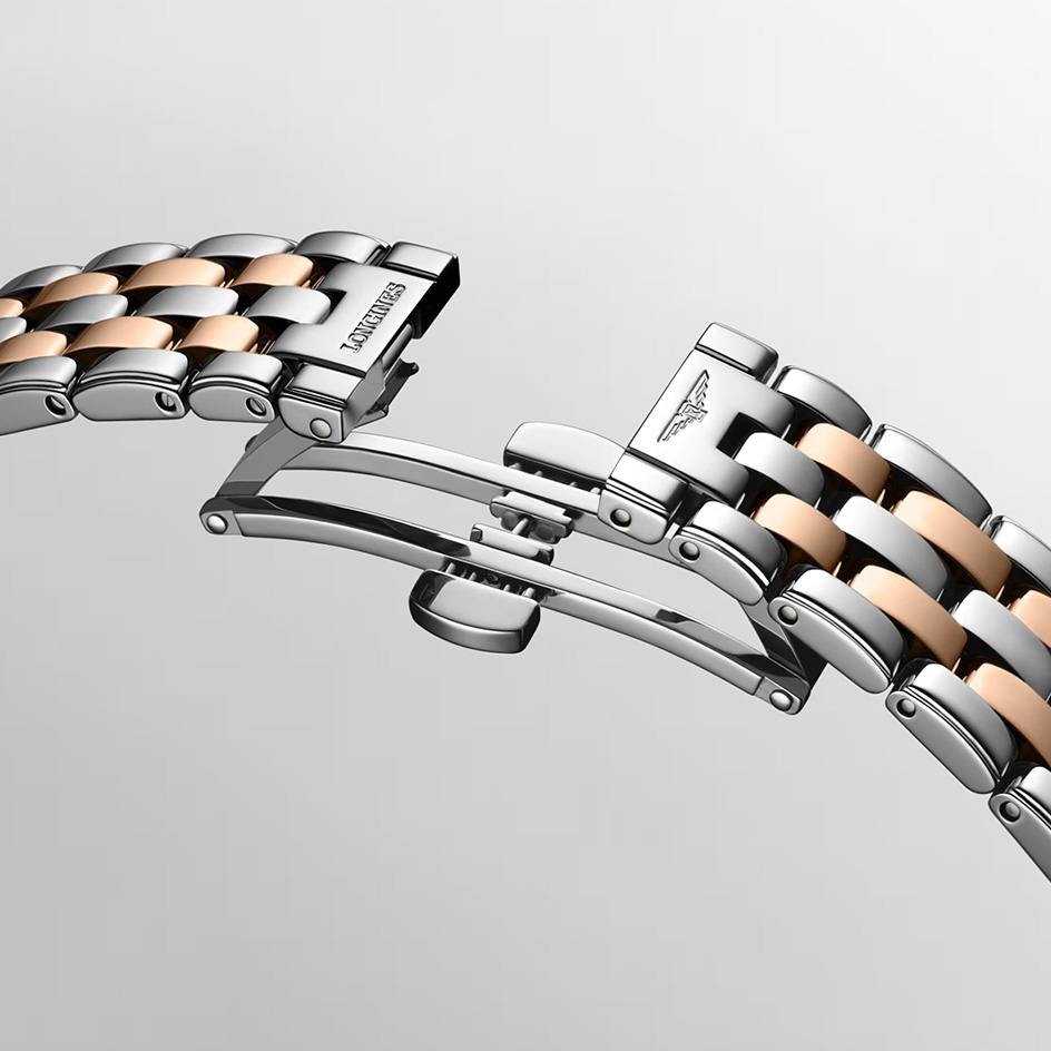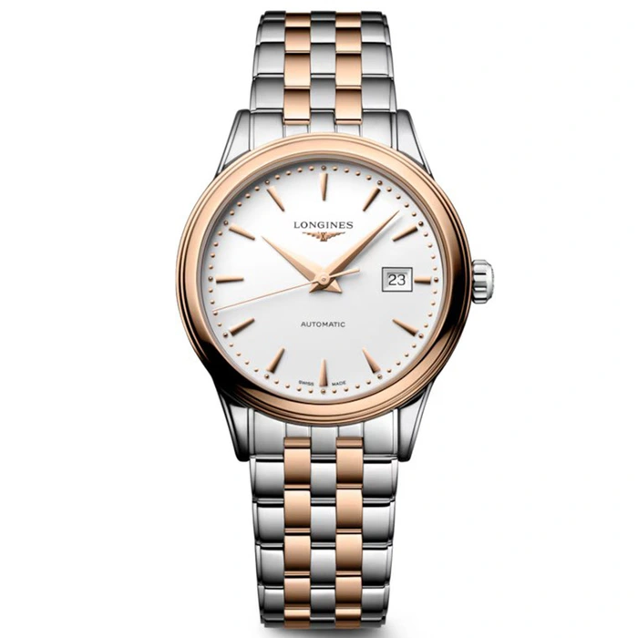 The Longines Flagship Classic L4.374.3.90.7 has an automatic movement, 3 Bar (30 meters) water resistance, White dial color, Stainless Steel & Pink Gold Plated case material and Bracelet.