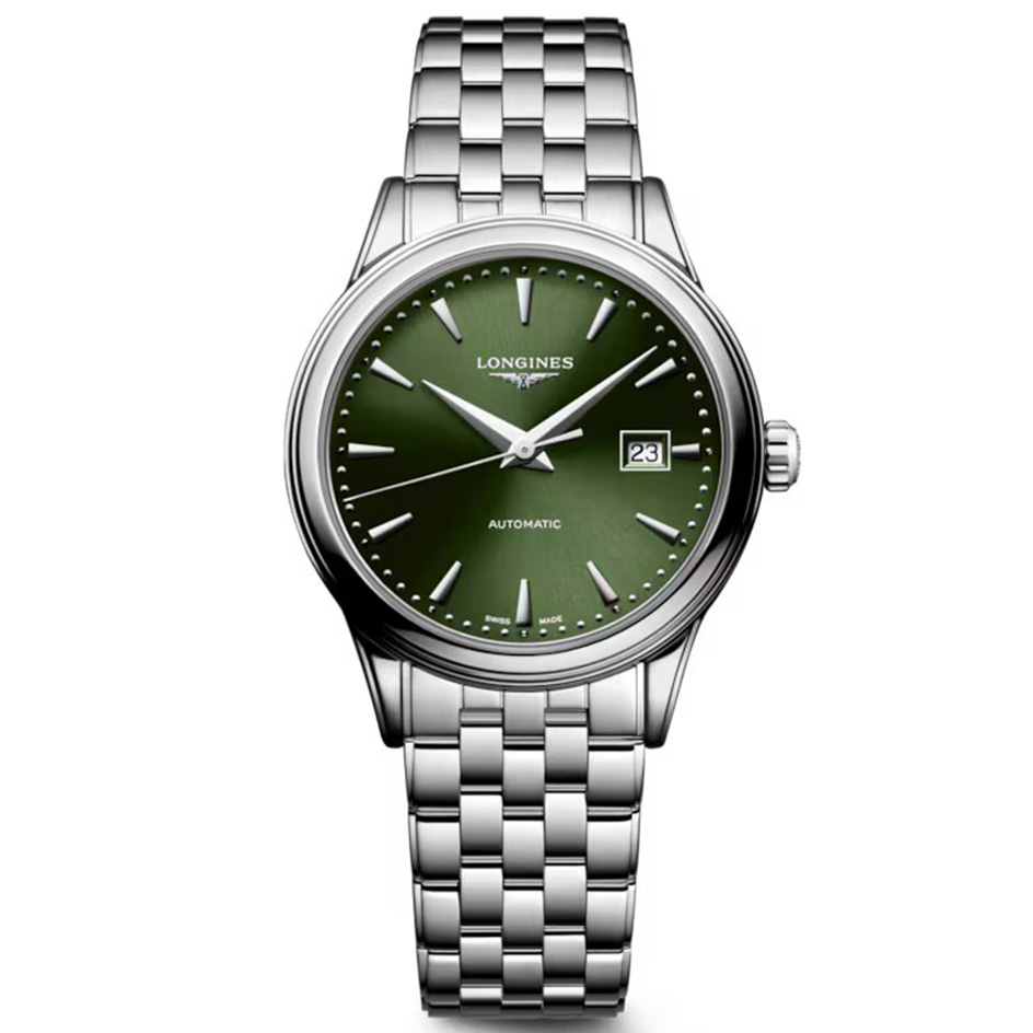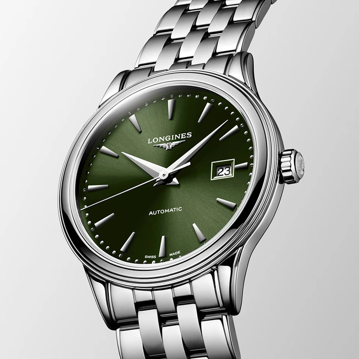 The Longines Flagship Classic L4.374.4.02.6 has an automatic movement, 3 Bar (30 meters) water resistance, Green dial color, Stainless Steel case material and Bracelet.