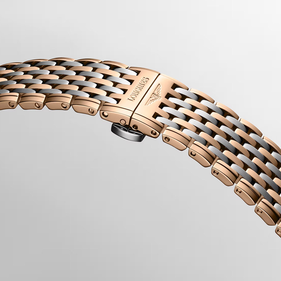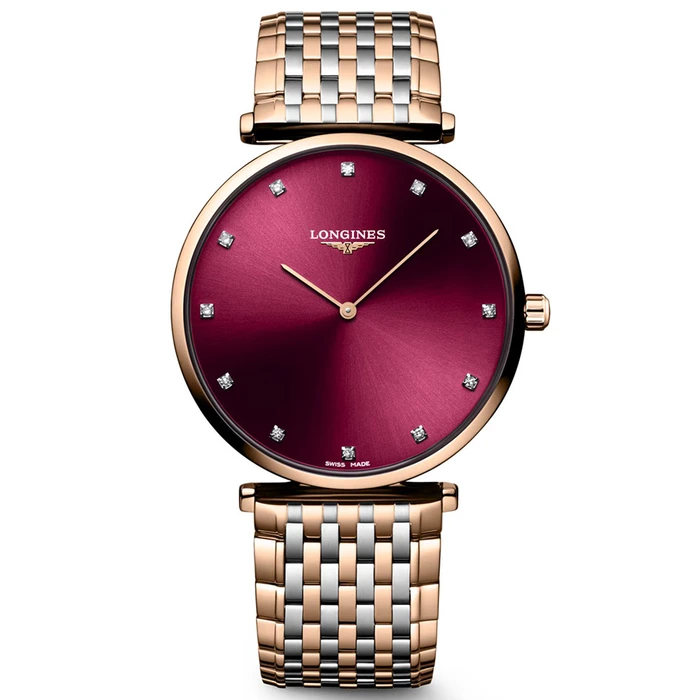 The La Grande Classique De Longines L4.866.1.68.7 has a quartz movement, 3 Bar (30 meters) of water resistance, Red dial, Stainless steel & Pink Gold Plated case material and bracelet.