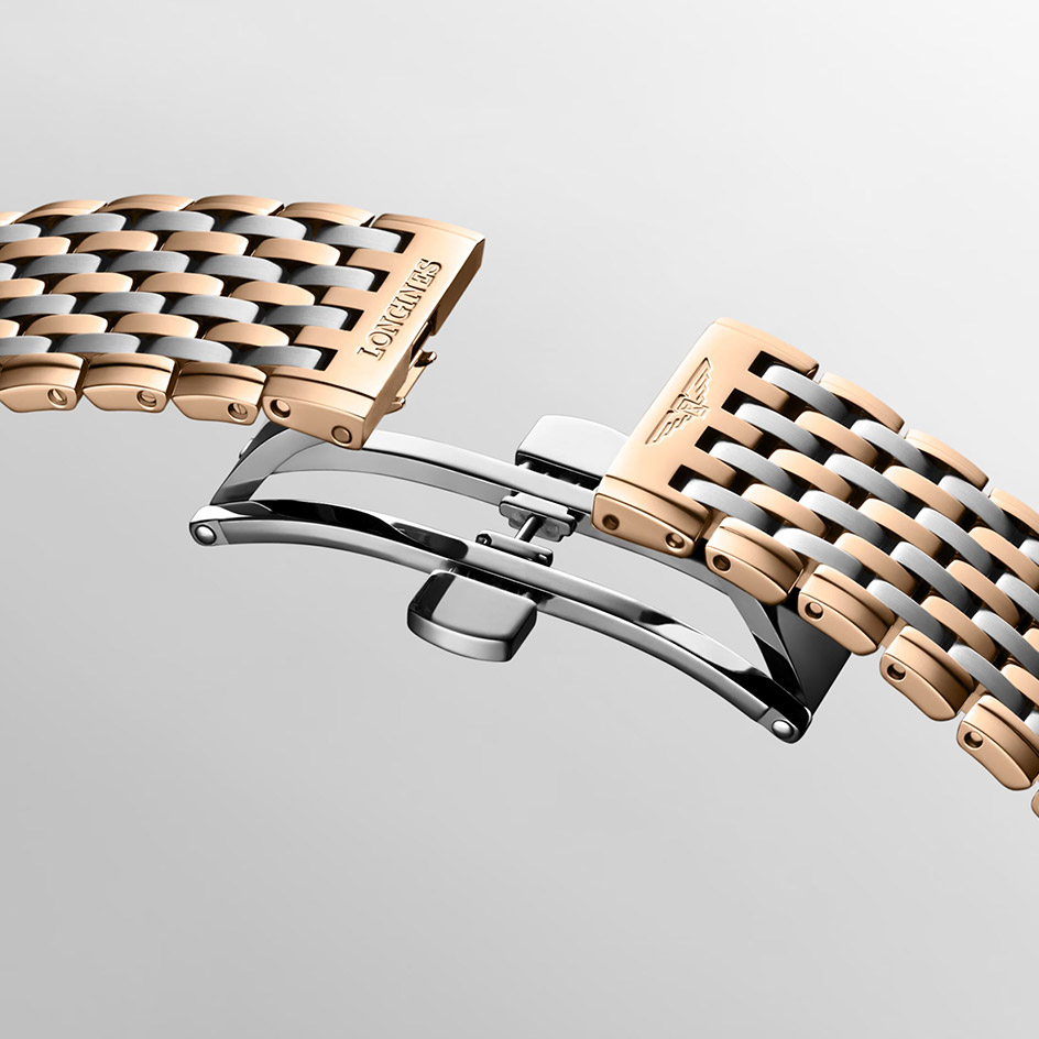The La Grande Classique De Longines L4.866.1.98.7 has a quartz movement, 3 Bar (30 meters) of water resistance, Blue dial, Stainless steel & Pink Gold Plated case material and bracelet.