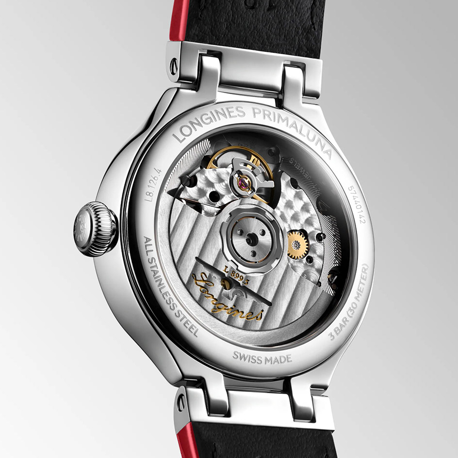 The Longines PrimaLuna L8.126.4.87.2 has a automatic movement with 3 Bar (30 meters) of water resistance, Mother of Pearl dial color, Stainless Steel case material & Leather strap.