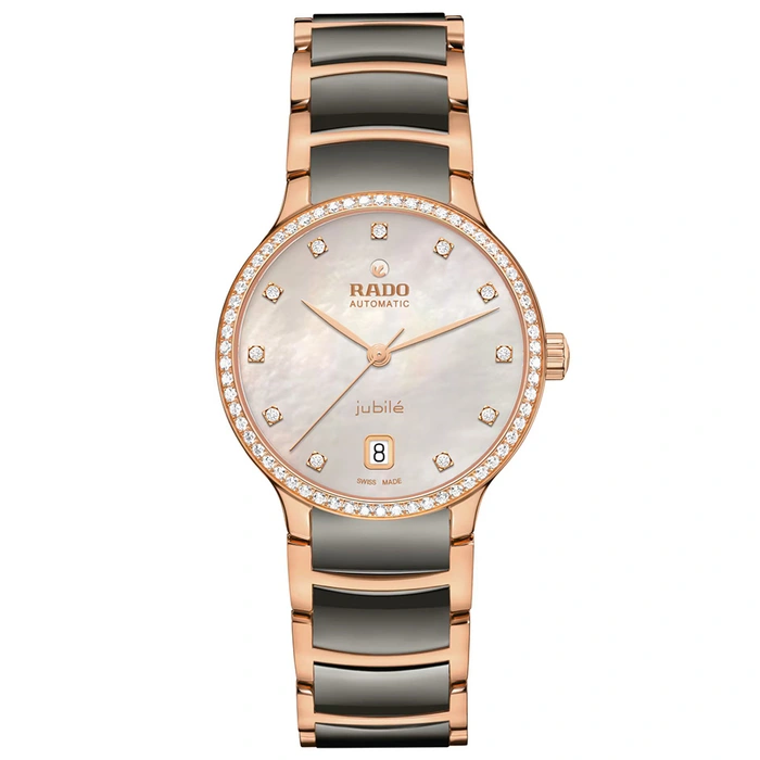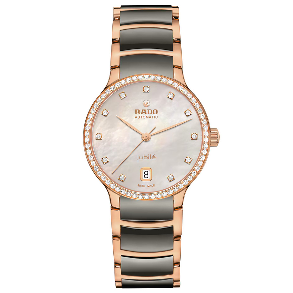 Experience the harmonious blend of artistic expression and refined design with the Centrix Super Jubile. Crafted in stainless steel and treated to a rose-gold-coloured PVD coating, the 35 mm case is crowned by a rose-gold-coloured PVD-coated stainless steel bezel set with 60 Top Wesselton VS-SI full-cut diamonds and a curved sapphire crystal with an anti-reflective coating on both sides, ensuring impeccable readability. Beating at its heart, and visible from the sapphire crystal case back, is the finely adjusted Automatic R763 calibre, regulated in five positions and equipped with a Nivachron™ hairspring, delivering exceptional accuracy and an impressive 80-hour power reserve. The light silver mother-of-pearl dial, adorned with 11 Top Wesselton VS-SI full-cut diamond indexes and a date window at 6 o’clock, radiates timeless elegance. The overall appearance of this iconic timepiece is completed with elegantly adjusted case lugs and a bracelet made of polished rose-gold-coloured PVD-coated stainless steel with plasma high-tech ceramic middle links, secured by a triple-fold brushed stainless steel clasp.