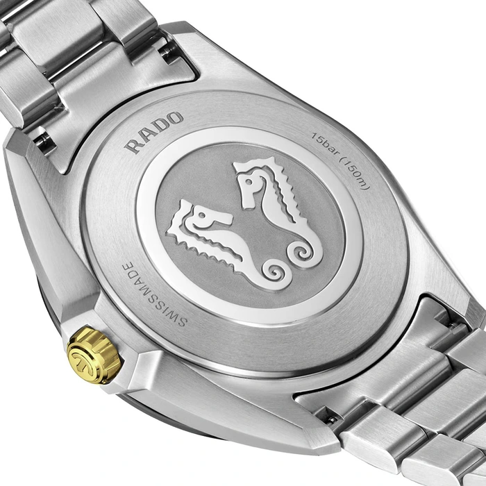 Rado HyperChrome R32280153 41.5 mm has a Quartz movement with 15 Bar (150 meters) of water resistance, Stainless steel case material, Black dial and Stainless Steel & Yellow Gold Plated bracelet.