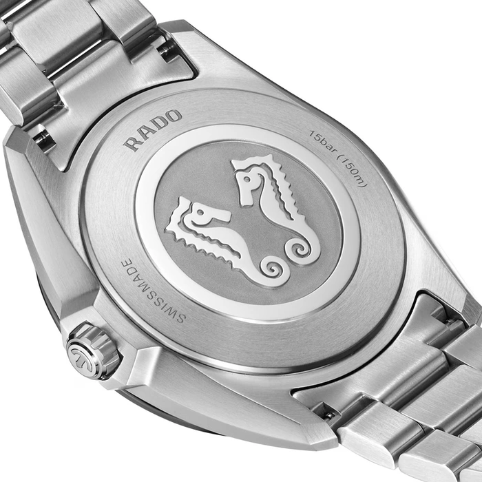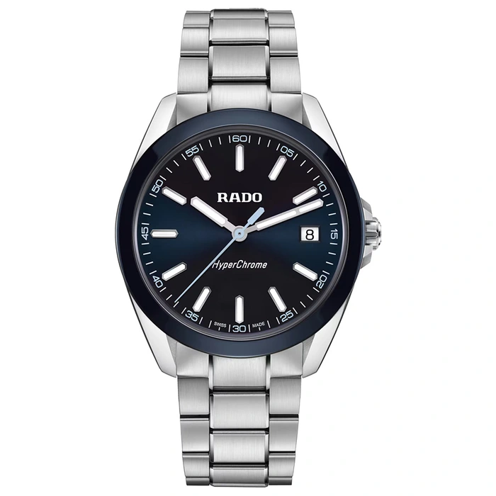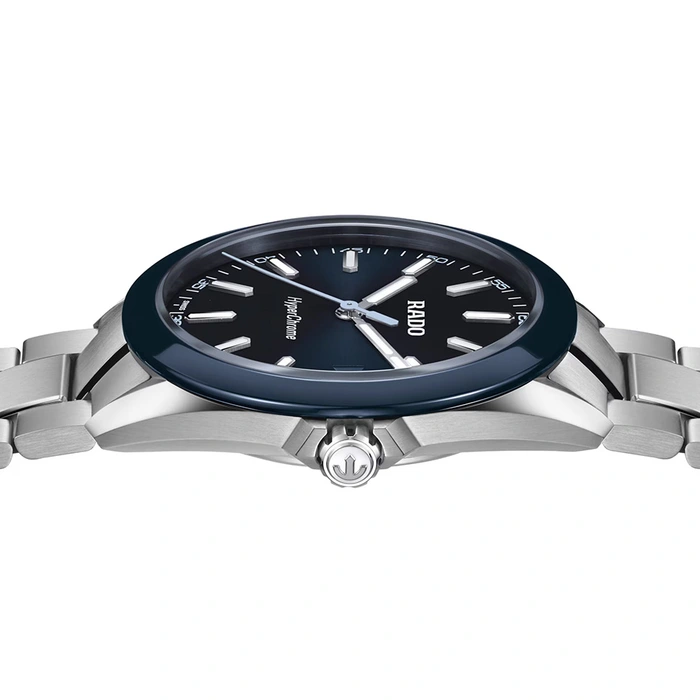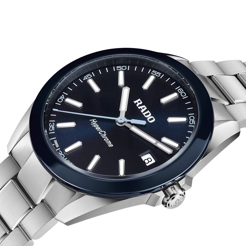 The HyperChrome Quartz is a contemporary expression of precision and material mastery, combining advanced watchmaking technology with a bold and enduring design. The case, sculpted from polished and brushed stainless steel, is encircled by a polished blue high tech ceramic bezel—an elemental combination of strength and refinement. Topping this resilient construction is a curved sapphire crystal with anti-reflective coating on the inner side, offering exceptional scratch resistance and crystal-clear legibility. With water resistance to 15 bar (150 metres), every element of the architecture is designed for lasting precision, durability, and confidence in any setting. At the heart of the watch, the Rado calibre R292 ensures exceptional accuracy and reliability. This 3-jewel quartz movement combines PreciDrive and HeavyDrive technologies, enabling precise regulation of each impulse and maintaining a deviation of no more than ±10 seconds per year. A discreet date window at 3 o’clock integrates seamlessly into the dial’s balanced design. The dark blue sunray dial offers a refined contrast to the rhodium-coloured hour and minute hands, as well as the applied indices —all treated with white Super-LumiNova® for optimal legibility in low light. A light blue second hand echoes the colour of the numerals on the minute track, adding a subtle, cohesive detail to the composition. At night, the twelve o’clock index and the minute hand emit a green glow, while the remaining indices and the hour hand radiate blue, ensuring quick, intuitive time reading in any lighting condition. Completing the case is a three-row stainless steel bracelet, featuring brushed outer links and middle links accented with polished bevels, creating a refined interplay of textures. It is secured by a triple-fold clasp with a three-position quick adjustment system, ensuring a precise and comfortable fit at all times.
