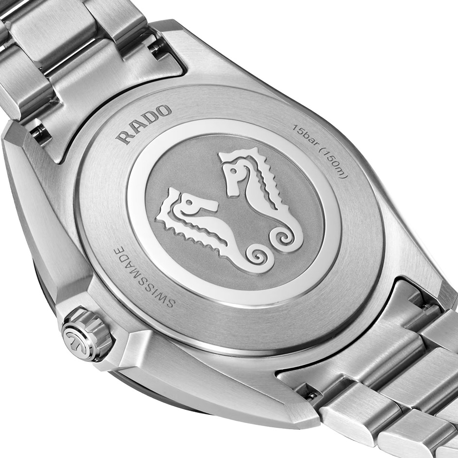 The HyperChrome Quartz is a contemporary expression of precision and material mastery, combining advanced watchmaking technology with a bold and enduring design. The case, sculpted from polished and brushed stainless steel, is encircled by a polished black high tech ceramic bezel—an elemental combination of strength and refinement. Topping this resilient construction is a curved sapphire crystal with anti-reflective coating on the inner side, offering exceptional scratch resistance and crystal-clear legibility. With water resistance to 15 bar (150 metres), every element of the architecture is designed for lasting precision, durability, and confidence in any setting. At the heart of the watch, the Rado calibre R292 ensures exceptional accuracy and reliability. This 3-jewel quartz movement combines PreciDrive and HeavyDrive technologies, enabling precise regulation of each impulse and maintaining a deviation of no more than ±10 seconds per year. A discreet date window at 3 o’clock integrates seamlessly into the dial’s balanced design. The ice blue lacquered sunray dial offers a refined contrast to the black PVD coated hands and indices, all treated with white Super-LumiNova® for optimal legibility in low light. At night, the twelve o’clock index and the minute hand emit a green glow, while the remaining indices and the hour hand radiate blue, ensuring quick, intuitive time reading in any lighting condition. Completing the case is a three-row stainless steel bracelet, featuring brushed outer links and middle links accented with polished bevels, creating a refined interplay of textures. It is secured by a triple-fold clasp with a three-position quick adjustment system, ensuring a precise and comfortable fit at all times.
