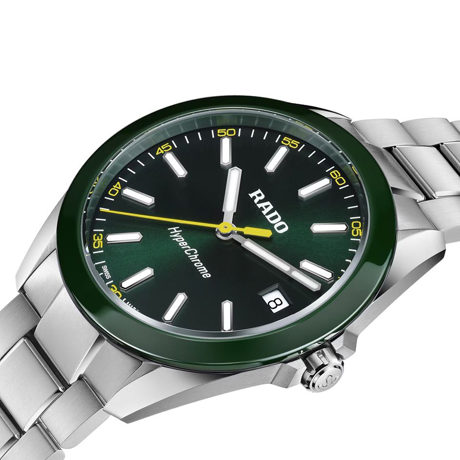 steel, is encircled by a polished green high tech ceramic bezel—an elemental combination of strength and refinement. Topping this resilient construction is a curved sapphire crystal with anti-reflective coating on the inner side, offering exceptional scratch resistance and crystal-clear legibility. With water resistance to 15 bar (150 metres), every element of the architecture is designed for lasting precision, durability, and confidence in any setting. At the heart of the watch, the Rado calibre R292 ensures exceptional accuracy and reliability. This 3-jewel quartz movement combines PreciDrive and HeavyDrive technologies, enabling precise regulation of each impulse and maintaining a deviation of no more than ±10 seconds per year. A discreet date window at 3 o’clock integrates seamlessly into the dial’s balanced design. The green sunray dial offers a refined contrast to the rhodium-coloured hour and minute hands, as well as the applied indices—all treated with white Super-LumiNova® for optimal legibility in low light. A yellow second hand echoes the colour of the numerals on the minute track, adding a subtle, cohesive detail to the composition. At night, the twelve o’clock index and the minute hand emit a green glow, while the remaining indices and the hour hand radiate blue, ensuring quick, intuitive time reading in any lighting condition. Completing the case is a three-row stainless steel bracelet, featuring brushed outer links and middle links accented with polished bevels, creating a refined interplay of textures. It is secured by a triple-fold clasp with a three-position quick adjustment system, ensuring a precise and comfortable fit at all times.