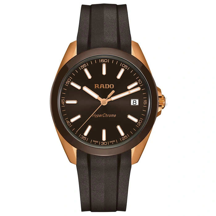 The HyperChrome Quartz is a contemporary expression of precision and material mastery, combining advanced watchmaking technology with a bold and enduring design. The case, sculpted from polished and brushed rose gold coloured PVD coated stainless steel, is encircled by a polished brown high tech ceramic bezel—an elemental combination of strength and refinement. Topping this resilient construction is a curved sapphire crystal with anti-reflective coating on the inner side, offering exceptional scratch resistance and crystal-clear legibility. With water resistance to 15 bar (150 metres), every element of the architecture is designed for lasting precision, durability, and confidence in any setting. At the heart of the watch, the Rado calibre R292 ensures exceptional accuracy and reliability. This 3-jewel quartz movement combines PreciDrive and HeavyDrive technologies, enabling precise regulation of each impulse and maintaining a deviation of no more than ±10 seconds per year. A discreet date window at 3 o’clock integrates seamlessly into the dial’s balanced design. The brown sunray dial offers a refined contrast to the rose gold-coloured hour, minute, and second hands, as well as the applied indices—all treated with white Super-LumiNova® for optimal legibility in low light. The rose gold tone also extends to the minute track, creating a subtle, cohesive harmony across the dial. At night, the twelve o’clock index and the minute hand emit a green glow, while the remaining indices and the hour hand radiate blue, ensuring quick, intuitive time reading in any lighting condition. Completing the case is a brown rubber strap, secured by a polished and brushed rose gold coloured PVD coated stainless steel pin buckle that ensures a precise and comfortable fit at all times.