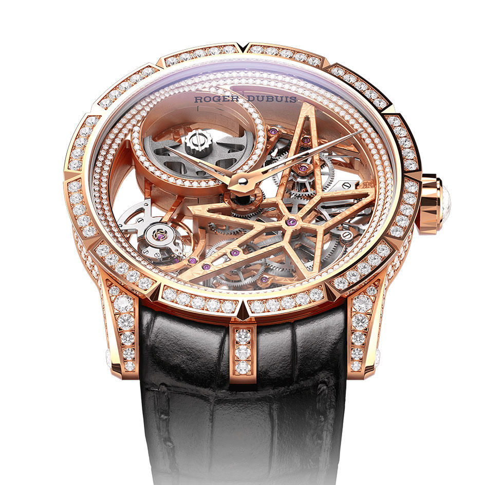 Roger Dubuis Excalibur Monobalancier RDDBEX0937 has a Automatic winding movement with 3 Bar (30 meters) of water resistance, Pink gold case, Skeleton dial, and Black Leather strap.