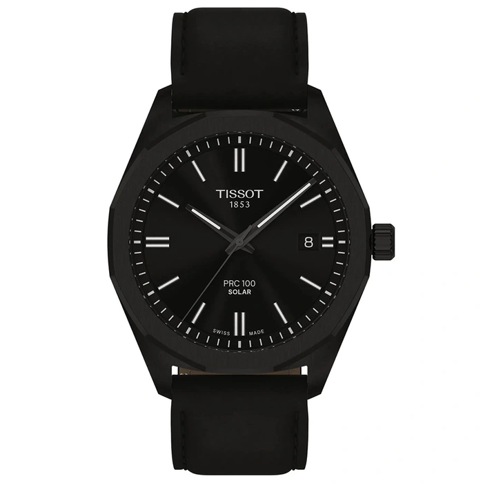 The Tissot PRC 100 Solar T151.422.36.051.00 has a quartz movement with 10 Bar (100 meters) of water resistance, Silver dial color, Stainless Steel & Black PVD Coating case material and Leather Strap.