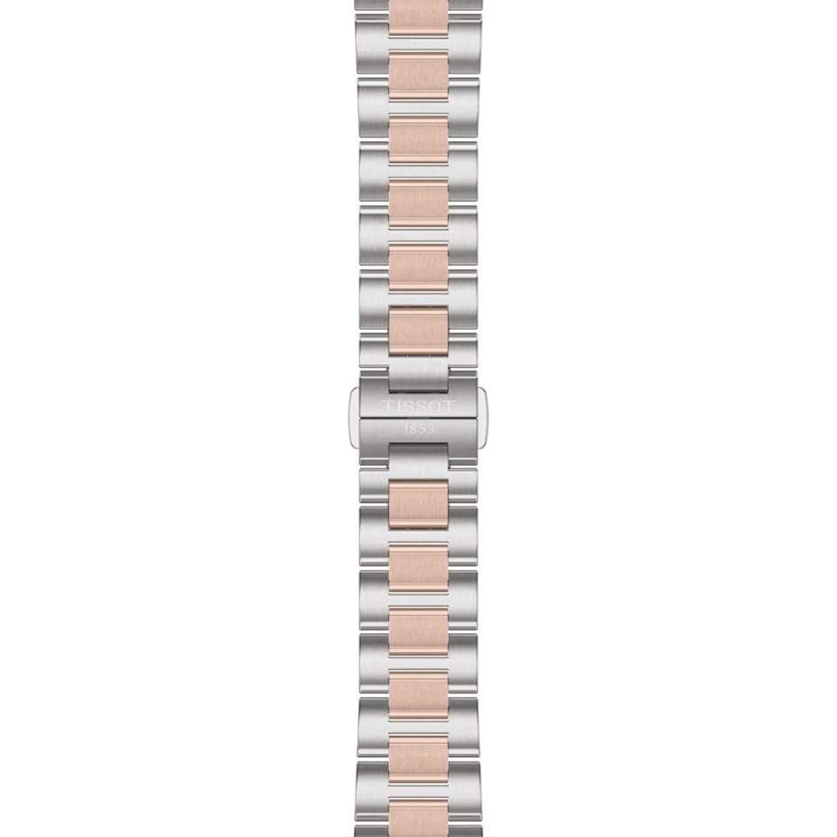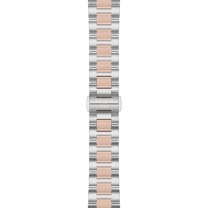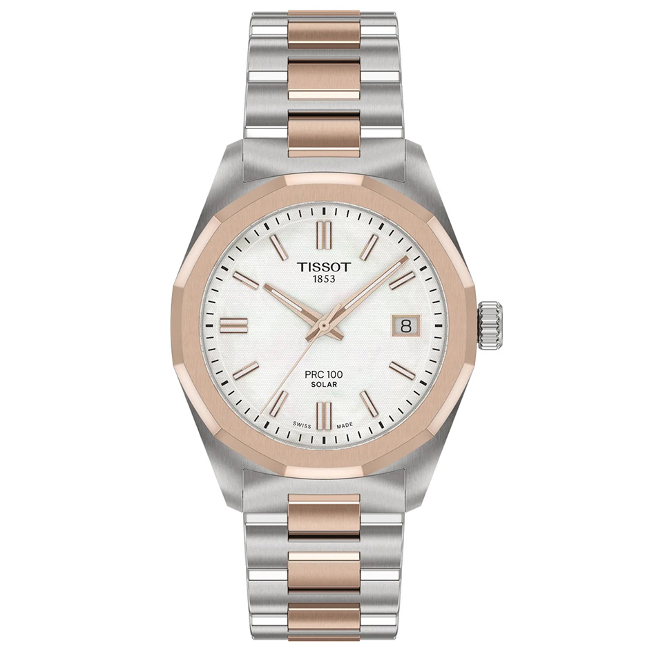 The Tissot PRC 100 Solar T151.822.22.111.00 has a quartz movement with 10 Bar (100 meters) of water resistance, Mother of Pearl dial color, Stainless Steel & Pink Gold PVD Coating Case material and bracelet.